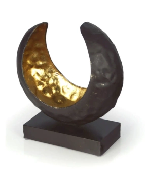 Dekoracja metalowa w kształcie półksiężyca na drewnianej podstawie