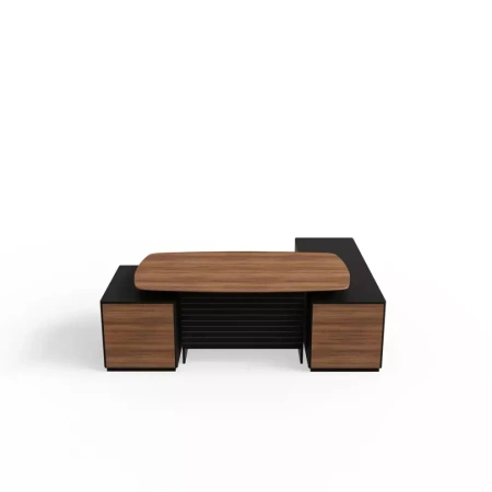Biurko o długości 220 cm łączy reprezentacyjny charakter z najwyższą jakością wykonania, stanowiąc efektowny element każdej przestrzeni. Starannie zaprojektowany blat i harmonijne proporcje sprawiają, że codzienne obowiązki stają się przyjemnością, a miejsce pracy emanuje elegancją. Z przodu przewidziano miejsce dla rozmówców, co podkreśla funkcjonalność i profesjonalny wygląd mebla. Wykonane z forniru orzech amerykański biurko zachwyca zaokrąglonym blatem.
