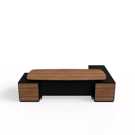 Biurko o długości 280 cm łączy reprezentacyjny charakter z najwyższą jakością wykonania, stanowiąc efektowny element każdej przestrzeni. Starannie zaprojektowany blat i harmonijne proporcje sprawiają, że codzienne obowiązki stają się przyjemnością, a miejsce pracy emanuje elegancją. Z przodu przewidziano miejsce dla rozmówców, co podkreśla funkcjonalność i profesjonalny wygląd mebla. Wykonane z forniru orzech amerykański biurko zachwyca zaokrąglonym blatem.