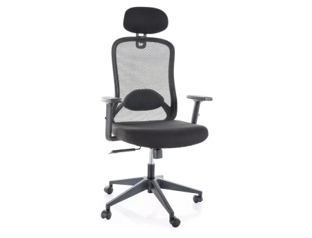 Oparcie pokrywa przewiewna tkanina membranowa typu mesh w kolorze czarnym z grafitowymi akcentami. Ten oddychający materiał zapewnia swobodną cyrkulację powietrza, dzięki czemu plecy nie przegrzewają się nawet podczas intensywnej pracy trwającej wiele godzin.