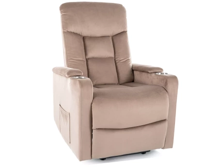 Fotel pionizujący rozkładany elektrycznie, tkanina aksamit: Bluvel 40, stelaż: metal, kolor: ciemny beżowy / czarny. Uchwyt na kubek, praktyczna kieszń na prawym boku, przewodowy pilot sterujący.