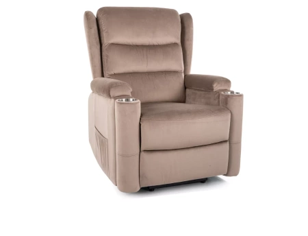 Fotel pionizujący rozkładany elektrycznie, tkanina aksamit: Bluvel 40, stelaż: metal, kolor: ciemny beżowy / czarny. Uchwyt na kubek, praktyczna kieszń na prawym boku, przewodowy pilot sterujący.