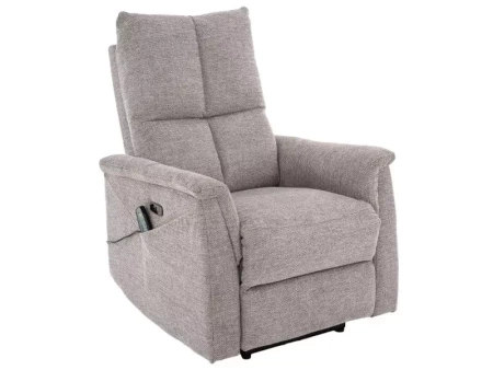 Fotel rozkładany elektrycznie z funkcją masażu i podgrzewania, tkanina Brego 07, stelaż: metal, kolor: szary / czarny. Rozkładanie sterowane przyciskami na prawym boku, port USB. Funkcje masażu i podrzewania aktywowane przewodowym pilotem.