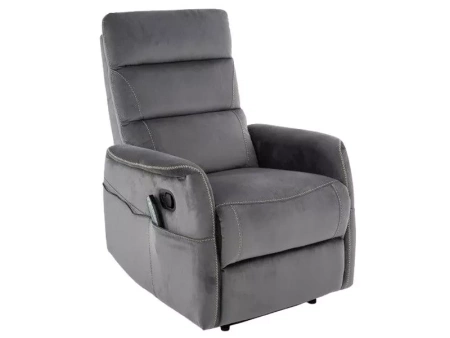 Fotel rozkładany z funkcją masażu i podgrzewania, tkanina aksamit: Bluvel 14, stelaż: metal, kolor: szary / czarny. Praktyczna kieszeń na prawym boku, przewodowy pilot sterujący funkcą masażu.