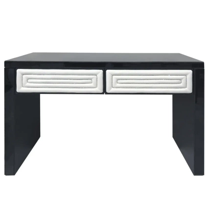Dwie pojemne szuflady sprawiają, że wszystkie drobne rzeczy osobiste zyskają nowe miejsce przeznaczenia, a Twoja przestrzeń w końcu stanie się uporządkowana. Konsola posiada dwie szuflady z systemem "push to open", dzięki czemu nie ma dodatkowych klamek, czy uchwytów. Urozmaiceniem czarnego, połyskującego stelażu są białe obicia szuflad, które wykonane zostały ze skóry ekologicznej. Ciekawy, geometryczny wzór na froncie obicia poprzetykany został naklejonymi cyrkoniami, dzięki którym komoda pięknie skrzy w świetle. Całość stanowi mebel przeniesiony iście z francuskiego apartamentu.