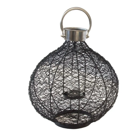 Efektowny, metalowy lampion o podłużnym kształcie. Będzie ozdobą każdego tarasu, ogrodu, bądź balkonu. Wyposażony w stalową rączkę, dzięki której lampion nadaje się do powieszenia. W całości obleczony czarną siatką, dzięki której zyskuje na lekkości. Posiada w środku podwieszaną podstawkę, na której osadzone jest szklane naczynie do umieszczenia podgrzewacza lub świecy. Dzięki ażurowemu wykonaniu paląca się w środku świeca będzie przepuszczać przyjemne światło. Rozświetli ogród nawet wieczorami. Jest idealnym źródłem dodatkowego światła. Doskonały dodatek na lato.