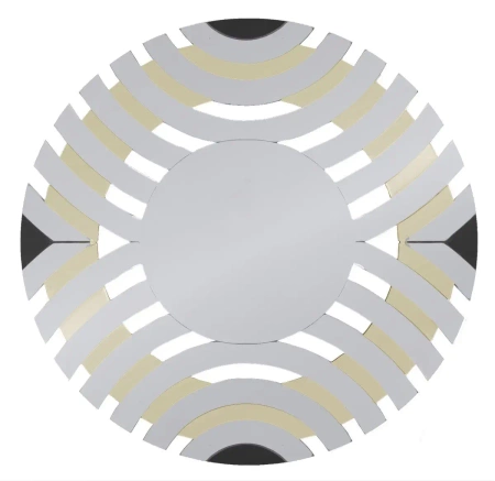 Ciekawego efektu dodają wstawki w czarnym kolorze, dwa czarne trójkąciki i dwa półkola, umieszczone naprzeciwko siebie. Nieszablonowy design i precyzyjne wykonanie sprawiają, że lustro będzie charakterystycznym elementem każdej aranżacji wnętrza, zwłaszcza w salonie oraz sypialni. Lustro wyposażone w zaczepy umożliwiające łatwy montaż. Będzie pasować do wnętrz urządzonych w stylu glamour.