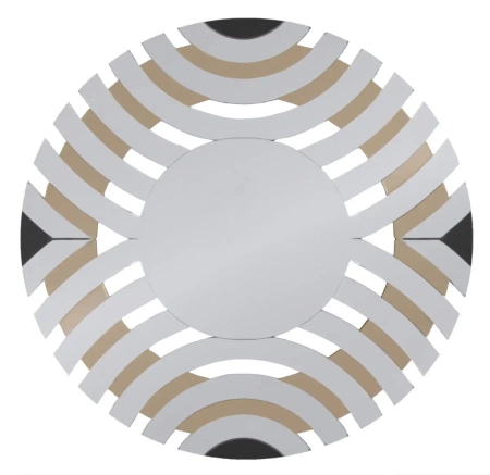Ciekawego efektu dodają wstawki w czarnym kolorze, dwa czarne trójkąciki i dwa półkola, umieszczone naprzeciwko siebie. Nieszablonowy design i precyzyjne wykonanie sprawiają, że lustro będzie charakterystycznym elementem każdej aranżacji wnętrza, zwłaszcza w salonie oraz sypialni. Lustro wyposażone w zaczepy umożliwiające łatwy montaż. Będzie pasować do wnętrz urządzonych w stylu glamour.