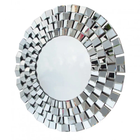 Lustro okrągłe Eris 100cm w ramie z lustrzanych fragmentów to okrągłe lustro dekoracyjne o masywnej ramie złożonej z mniejszych kawałków szkła ze starannie oszlifowaną fazą, ułożonych pod różnymi kątami. Chaotyczne ułożenie poszczególnych zwierciadeł wywołuje na powierzchni lustra nowoczesnego Eris niepowtarzalną grę światłocieni, dzięki czemu Eris stanowi wspaniały i wyrazisty przykład użytkowej dekoracji naściennej.