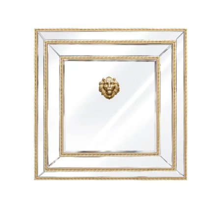 Lustro Sharon 100/100cm - Lustro kwadratowe, którego rama posiada trzy ozdobne plecione złote listwy. Niepowtarzalnego wyglądu nadaje lustru ozdoba w postaci głowy lwa w złotym kolorze. Lew symbolizuje władzę, moc, potęgę, majestat, dumę, zwycięstwo, męskość, płodność, odwagę, triumf, działanie, ruchliwość. Oznacza także ambicję, umysł, dzikość, mądrość, boską moc, sprawiedliwość i szczodrość.