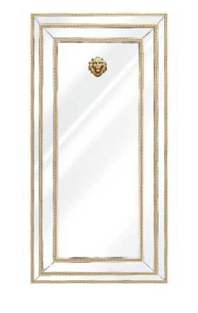 Lustro Sharon 180/90cm - Lustro prostokątne, którego rama posiada trzy ozdobne plecione złote listwy. Niepowtarzalnego wyglądu nadaje lustru ozdoba w postaci głowy lwa w złotym kolorze. Lew symbolizuje władzę, moc, potęgę, majestat, dumę, zwycięstwo, męskość, płodność, odwagę, triumf, działanie, ruchliwość. Oznacza także ambicję, umysł, dzikość, mądrość, boską moc, sprawiedliwość i szczodrość. Dzięki tej symbolice i przymiotom lustro będzie idealnym dodatkiem dla osób odważnych i stawiających na mocne akcenty w wystroju wnętrz.