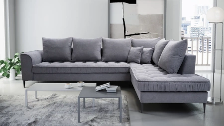 Konstrukcja opiera się na solidnym stelażu z litego drewna iglastego wzmocnionym elementami płyty MDF i płyty wiórowej. Siedzisko wyposażone jest w sprężyny faliste oraz wysokoelastyczną piankę T-30, która gwarantuje trwałość i odpowiednie wsparcie ciała. Luźne poduchy oparciowe wypełnione są miękkim silikonem, zapewniając wyjątkowy komfort. Tył narożnika jest w pełni tapicerowany, co pozwala na dowolne ustawienie mebla w przestrzeni.