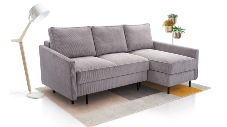 Nowoczesny narożnik o lekkiej, geometrycznej formie, który przyciąga uwagę przyjemną w dotyku, strukturalną tkaniną. Jego proste linie i subtelne detale sprawiają, że świetnie odnajdzie się w przestrzeniach utrzymanych w stylu minimalistycznym, skandynawskim czy loftowym. Wysokie nóżki dodają mu wizualnej lekkości, a wygodne poduchy oparciowe zapewniają komfort codziennego wypoczynku. To idealna propozycja dla tych, którzy szukają mebla łączącego funkcjonalność z nowoczesną estetyką.