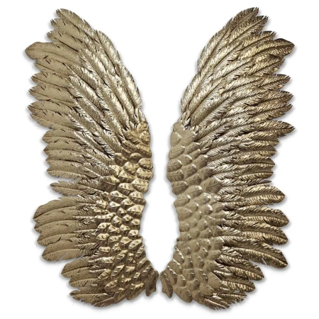Trójwymiarowa powierzchnia skrzydeł dodaje im głębi i wyjątkowości, a delikatny połysk metalu podkreśla ich szlachetność oraz wprowadza do wnętrza subtelny blask. Dzięki swoim rozmiarom i oryginalnej formie, skrzydła doskonale sprawdzają się jako dekoracja ścienna, idealnie komponując się zarówno w nowoczesnych, minimalistycznych przestrzeniach, jak i w bardziej klasycznych aranżacjach.