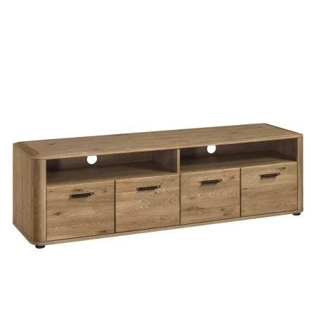 Szafka oferuje przemyślany układ przestrzeni z sześcioma miejscami do przechowywania. Znajdziesz tu cztery zamykane szafki z drzwiczkami wyposażonymi w system cichego domyku, które dyskretnie ukryją płyty, gry, akcesoria i inne przedmioty. Dodatkowo dwie otwarte wnęki idealnie nadają się do eksponowania dekodera, konsoli czy stylowych dekoracji.