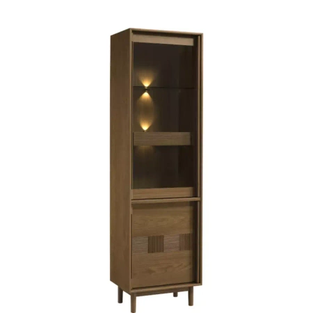 Wąska witryna dębowa to doskonałe rozwiązanie, jeśli cenisz sobie każdy centymetr przestrzeni. Jej smukła sylwetka (58 cm szerokości i 204 cm wysokości) pozwala na maksymalne wykorzystanie potencjału wnętrza bez jego przytłaczania. Całość wspiera się na solidnych, drewnianych nóżkach, które dodają konstrukcji wizualnej lekkości i ułatwiają utrzymanie czystości pod meblem. Jako witryna lewostronna, pozwala na idealne wkomponowanie jej w układ Twojego salonu lub jadalni, zapewniając komfortowy dostęp do zawartości.