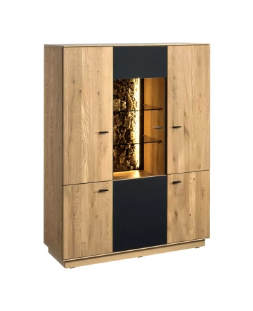- Nowoczesna wysoka komoda, wykonana z litego drewna dębowego. W przeszklonej części znajduje się podświetlany korek.