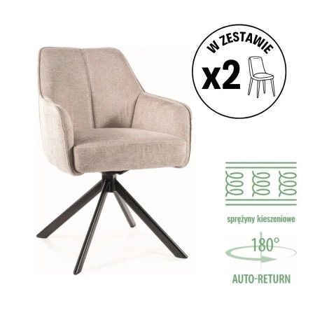 Krzesło, tkanina Brego, kolor: jasny beż 31, stelaż: metal, czarny mat. Siedzisko obracane w zakresie 180st, z funkcją powrotu do pierwotnej pozycji. Siedzisko wyposażone w sprężyny kieszeniowe.
